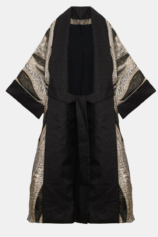Black and Gold Jacquard Kimono Overcoat with Metallic Accents