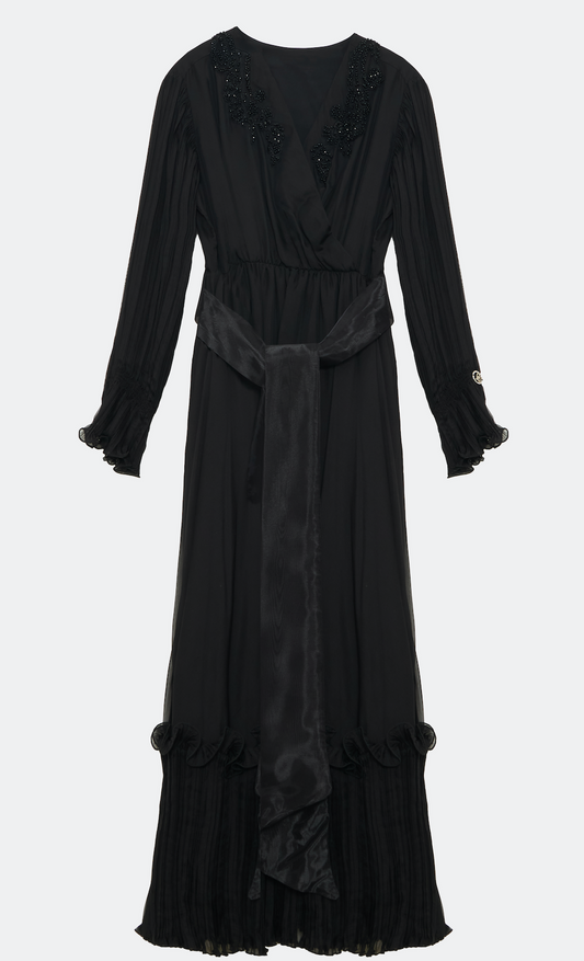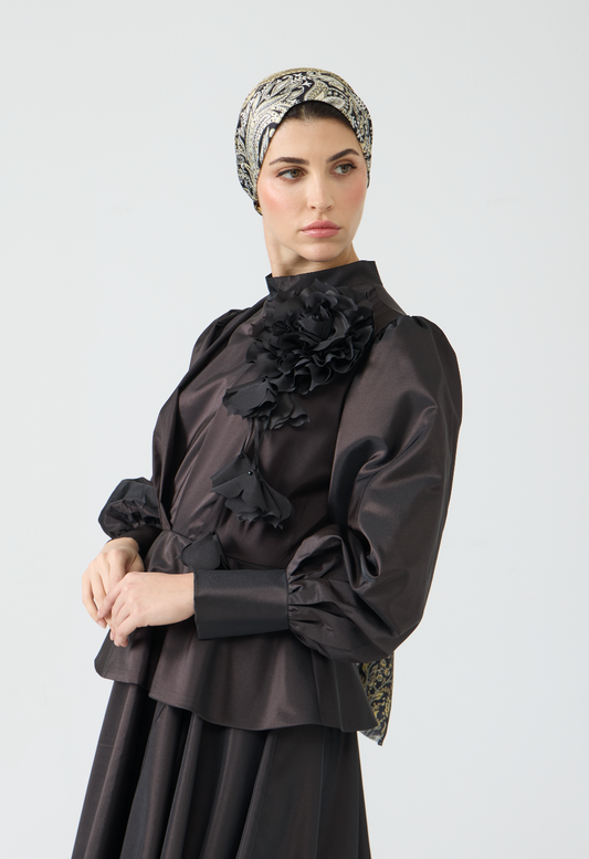 Black Evening Gown with Ruffled Floral Applique and Peplum Detail