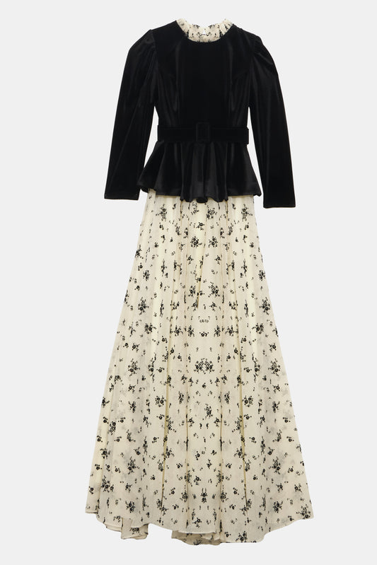 Out Of StockVelvet Peplum Evening Gown with Floral Skirt