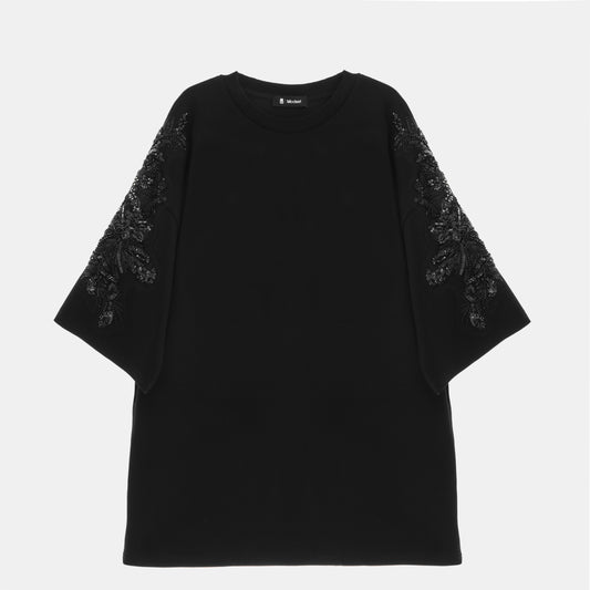 Black Oversized T-Shirt with Embellished Sleeves & Pockets