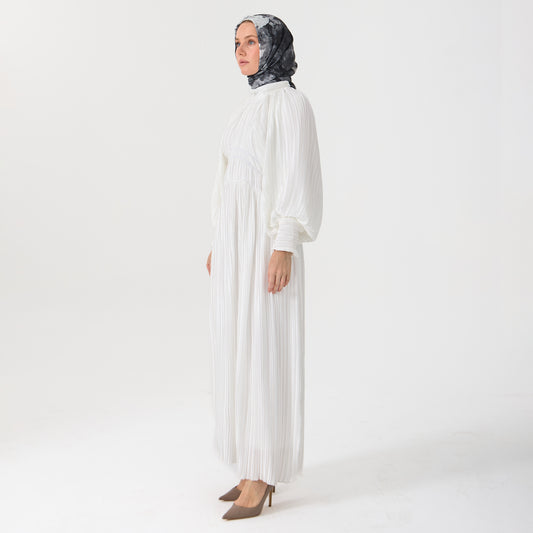 Pleated White Maxi Dress with Balloon Sleeves & Elastic Waist