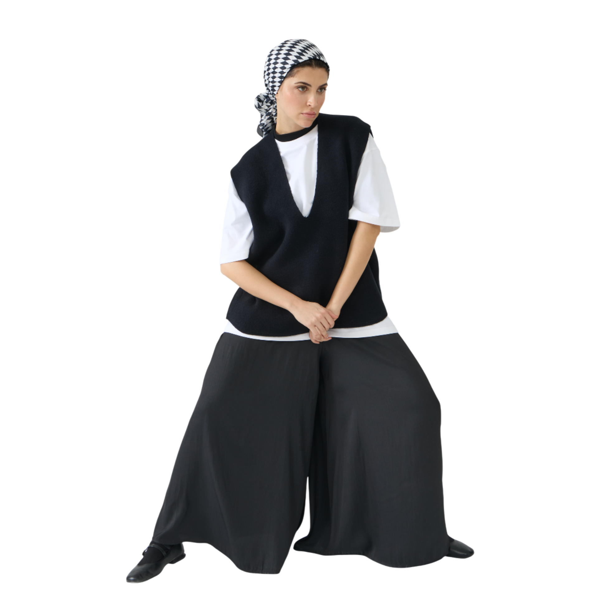 Modest wide-leg pleated palazzo pants, designed for a flowy and sophisticated look while ensuring full coverage.